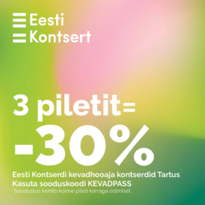 Ostes vähemalt 3 piletit — kas ühele või mitmele Eesti Kontserdi kevadkontserdile Tartus (v.a. Saabastega kass) — saad kogu ostukorvilt –30% soodustust.